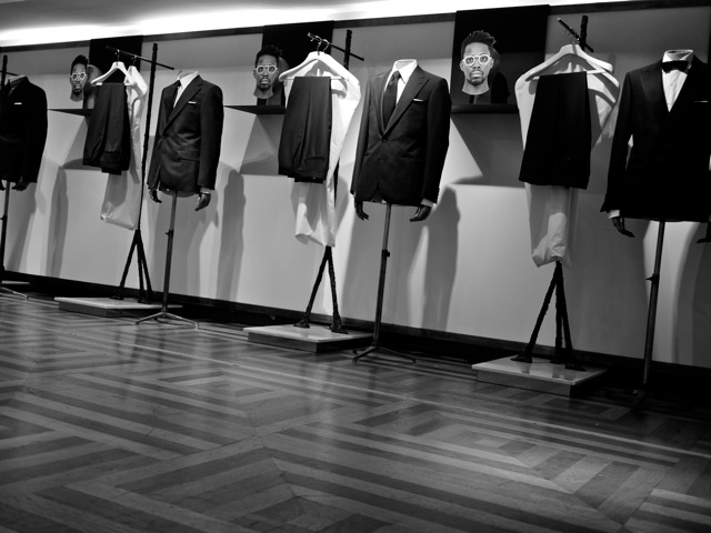 Right: Evening Suit - Midnight mohair single breasted suit with flat front trousers, white Sea Island cotton shirt with scallop collar and dark grey knitted tie.