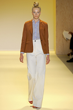 Let's start with the trousers, high-waist flares tailored to a T and shown in navy, gray, peach, and tomato red, among other colors. The fabrics were unpretentious (twill and denim), but the effect was ridiculously chic, coupled with smart lace blouses and cropped hand-knit sweaters and tuxedo jackets. A pair in cement gray, with sailor-pant-inspired lacing up the back, is a must-have for Spring; they may even sound the death knell of stovepipes. With the sundresses and diaphanous long skirts, Lippes went so far over the horizon of pretty, he wound up back at edgy. (Pretty does feel subversive, after all the spiked platforms and leather leggings of the past few years.)